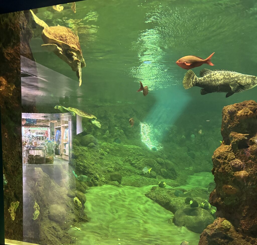 水槽の中では、ゆったりと泳ぐウミガメたちと、色とりどりの熱帯魚が共に暮らしています。青いライトに照らされた水槽の中を泳ぐ姿はとても幻想的で、つい時間を忘れて見入ってしまうほど。